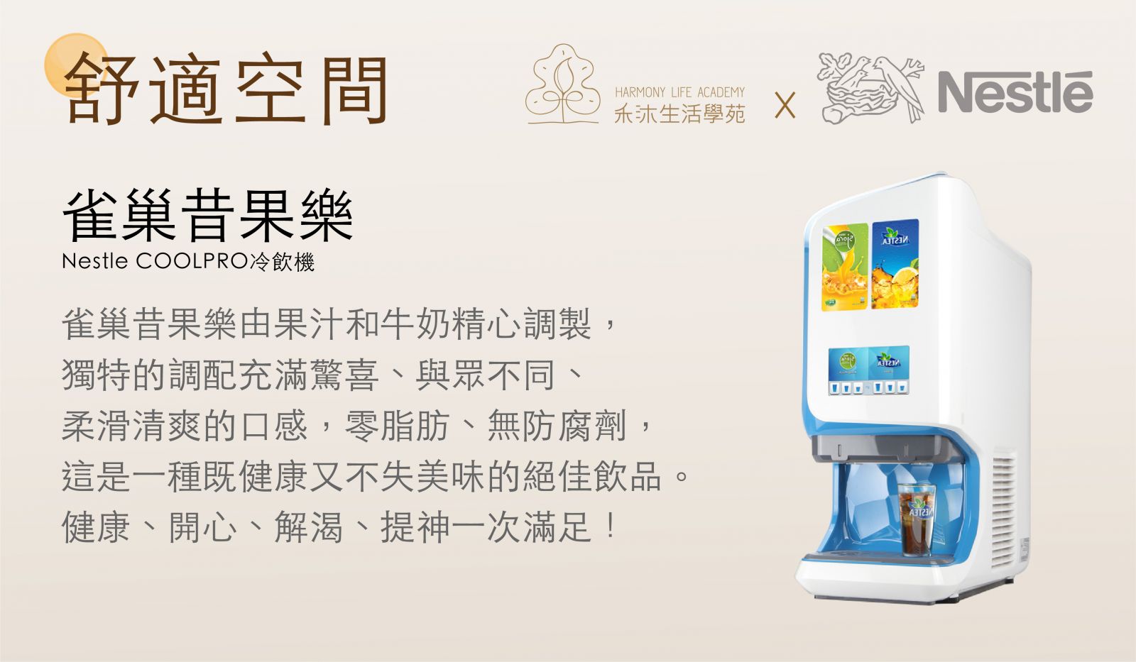 禾沐生活學苑準備15種健康優質飲料,咖啡、茶飲、果汁一應俱全,有全球排名第66名的雀巢公司,第348名的3M公司,除了每天做好清潔保養,也會定期送驗檢測水質與品質。