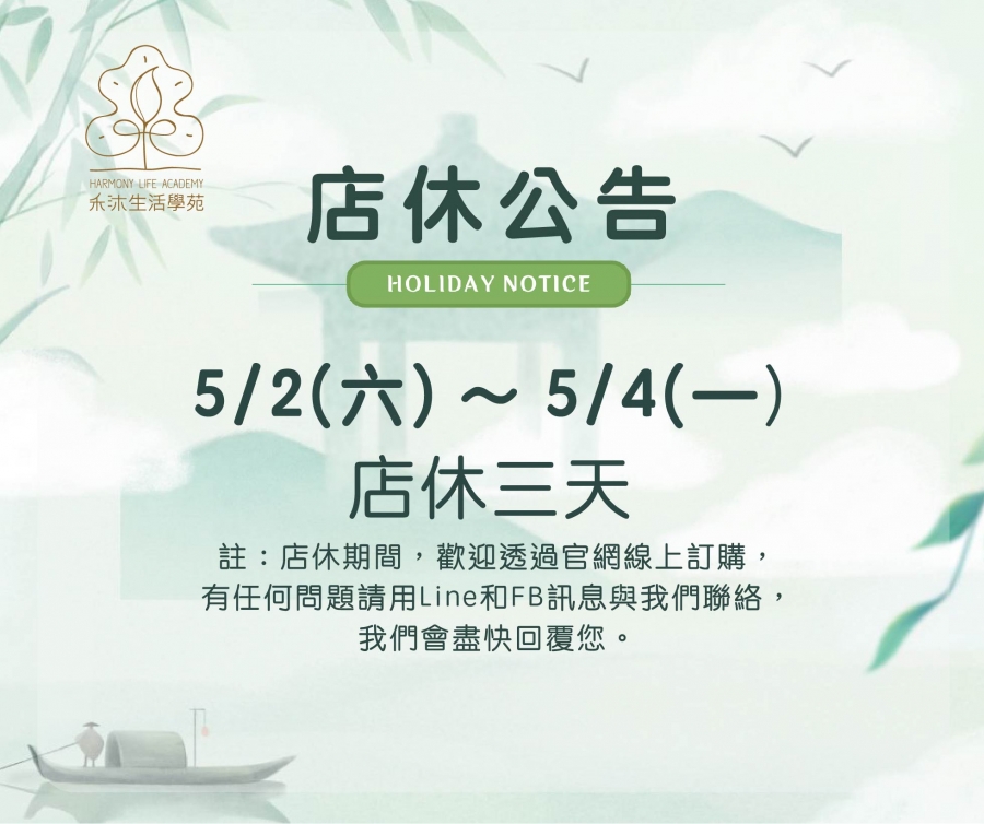 詳細說明禾沐生活學苑 2026年勞動節營業公告 2026/5/2(六)-5/4(一)勞動節假期不營業,休假期間歡迎透過官網線上報名,有任何問題請用Line和FB訊息與我們聯絡,我們會盡快回覆您。 祝福您 事事如意,心想事成 禾沐...