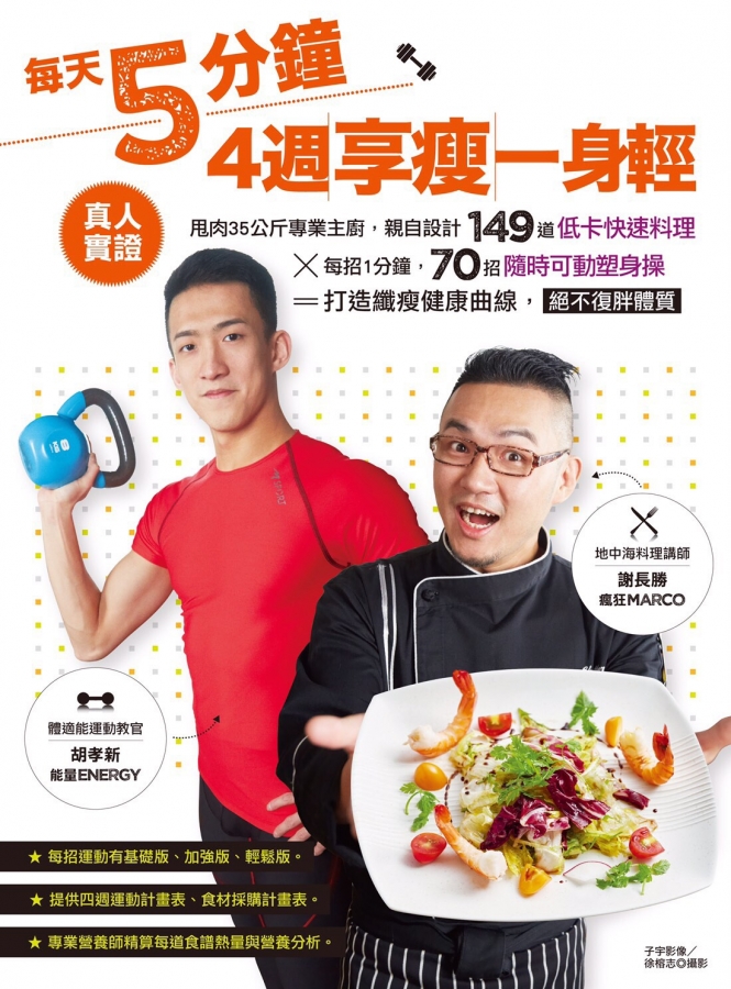 曾經是118公斤胖子的Marco成功甩肉35公斤,親自設計149道低卡快速的多元料理,符合運動後能快速完成或上班族能簡便操作的美味餐點,並且由專業營養師精算每道食譜所含熱量與營養分析,能確實達到健康瘦身的效果。